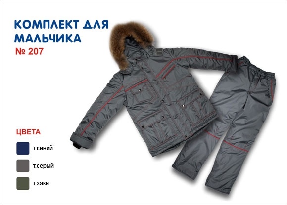 Утеплитель: синтепон 300 г/ м2 (куртка), синтепон 200 г/ м2 (брюки).